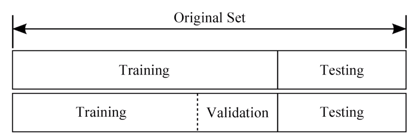 모델 학습시에 사용할 데이터는 Training set(학습용 데이터셋)과 Validation set(검증 데이터 셋), Test set(평가 데이터셋, 테스트셋)으로 구분하여 실제 실무에서 적용하여 사용함.