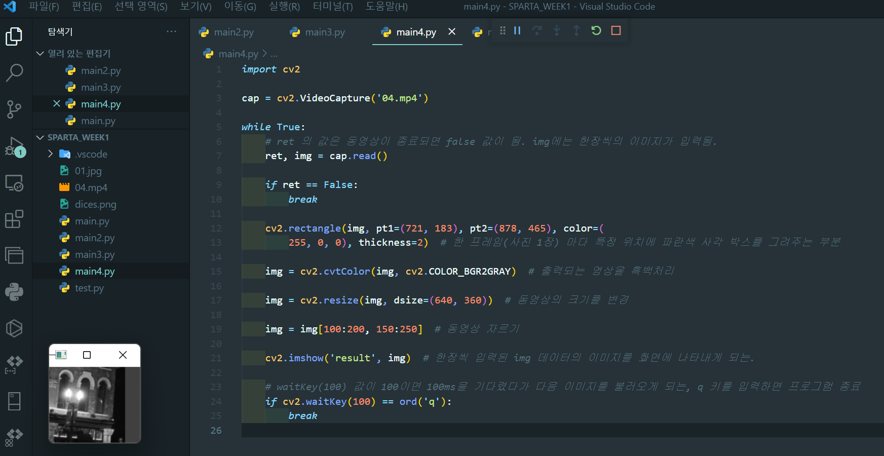 위 코드는 04.mp4 동영상 파일의 한프레임(이미지 1장)씩 읽어서 화면에 출력해 주는 프로그램.