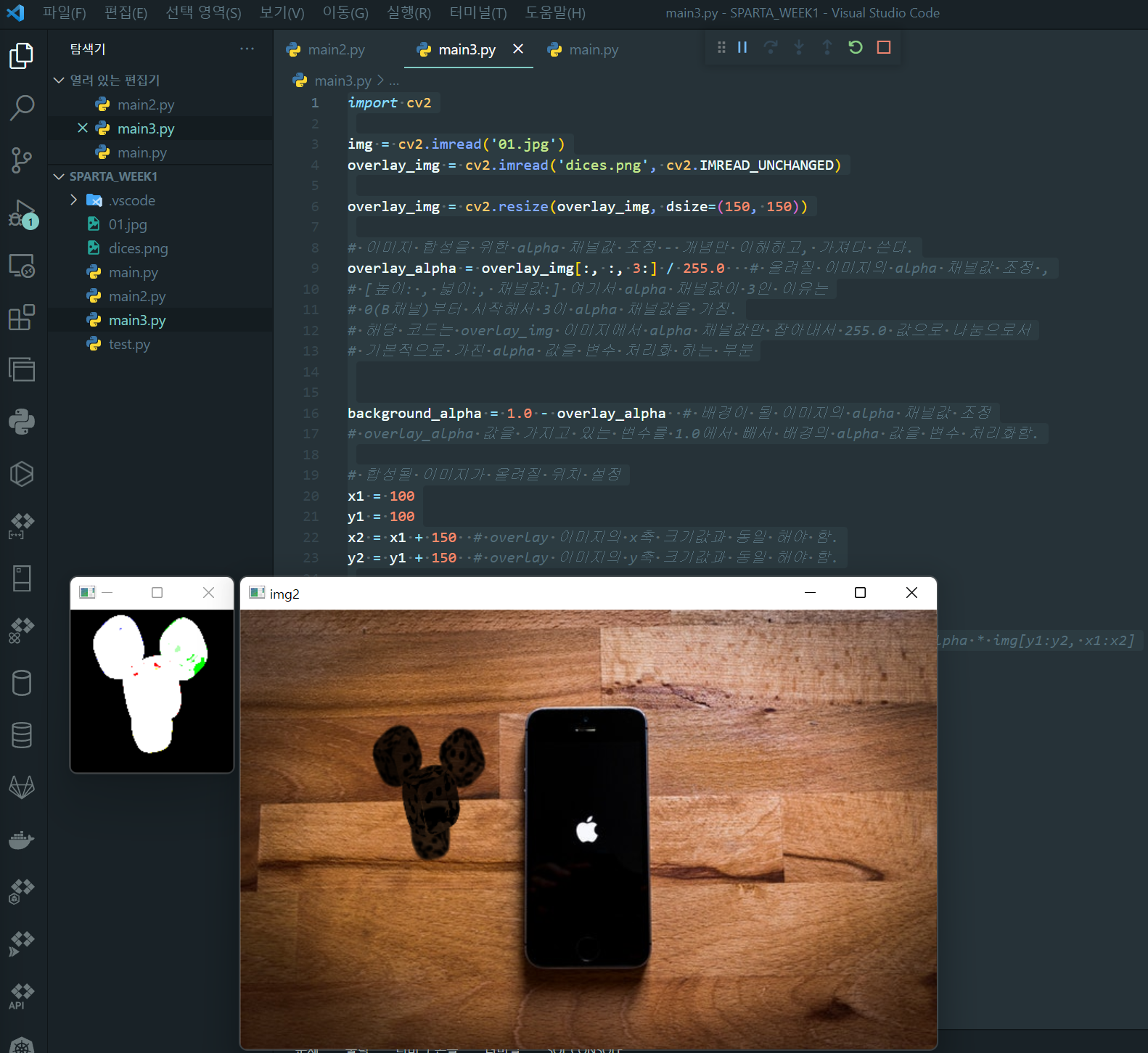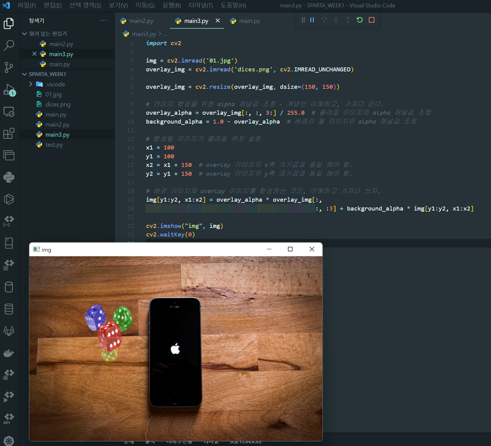 # 배경 이미지와 overlay 이미지를 합성하는 코드, 이해하고 가져다 쓰자.