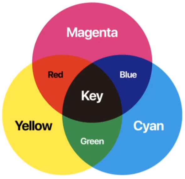 CMYK(하늘색,분홍색,노랑색,검정색) 4가지 색깔을 섞어 표현하는 법, RGB(빨간색,녹색,파란색) 3색을 섞어서 표현하는 방법등, 매우 다양한 컬러를 표현하는 시스템들이 있음.