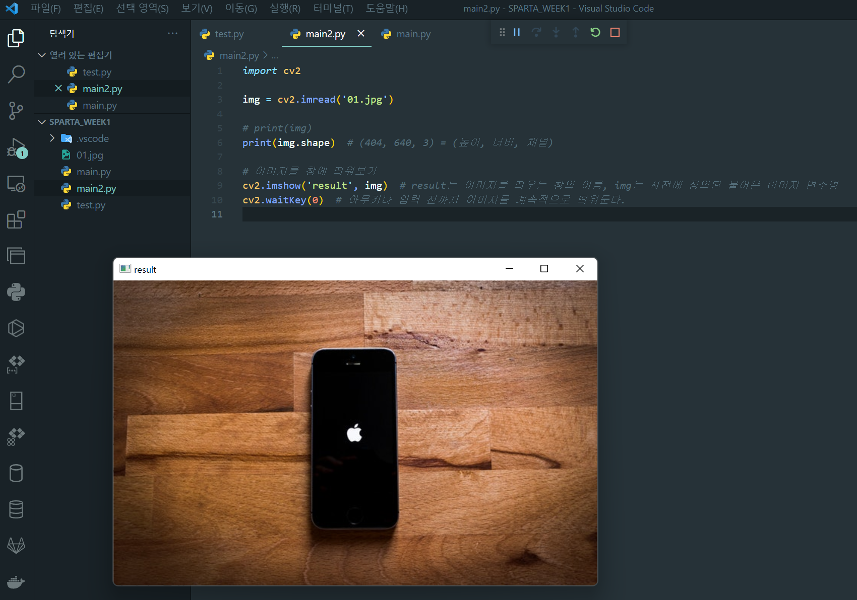 - 신규 테스트를 위한 main3.py 파일을 해당 작업 디렉토리에 만들고 아래의 코드를 입력한다.
