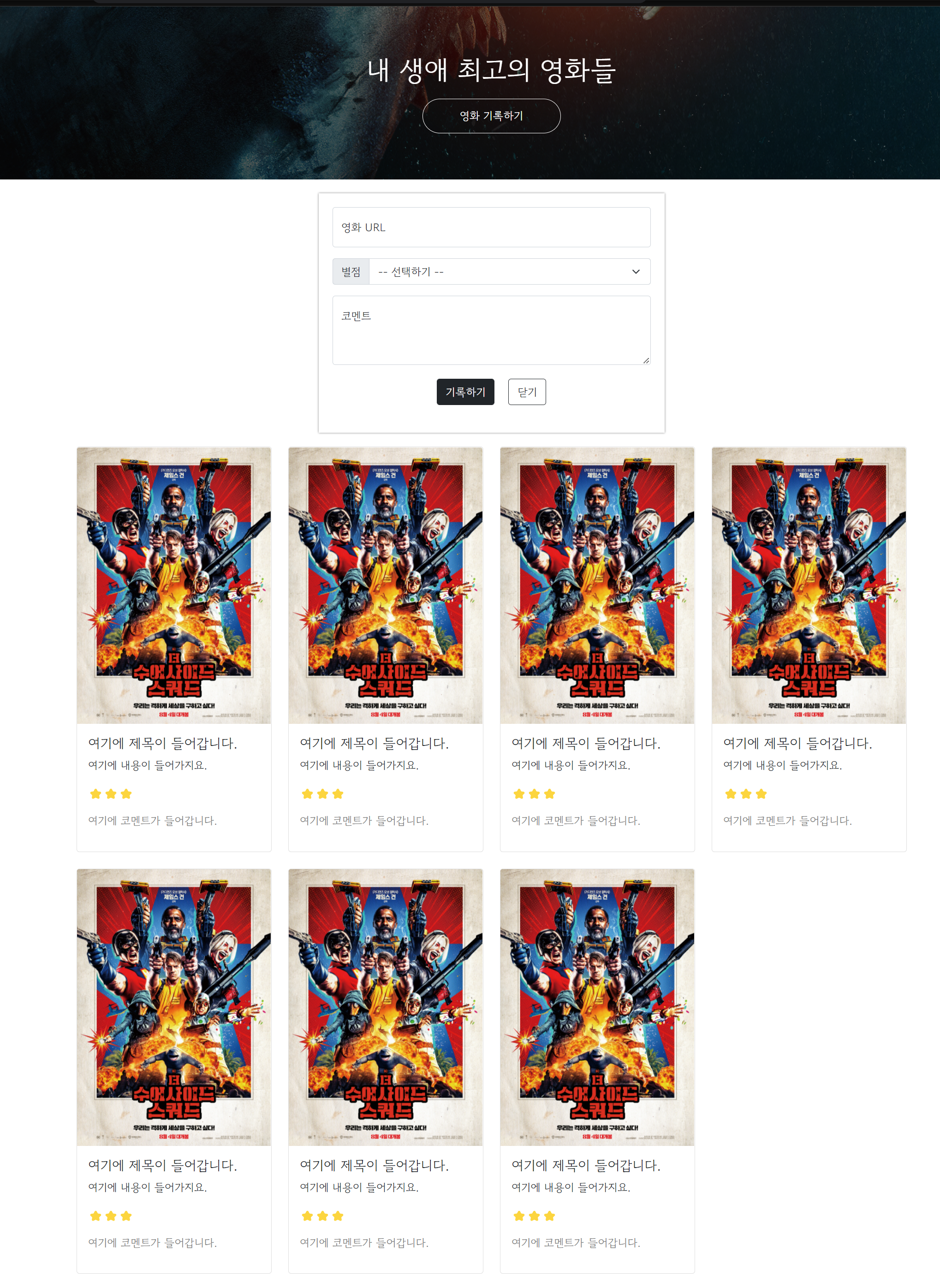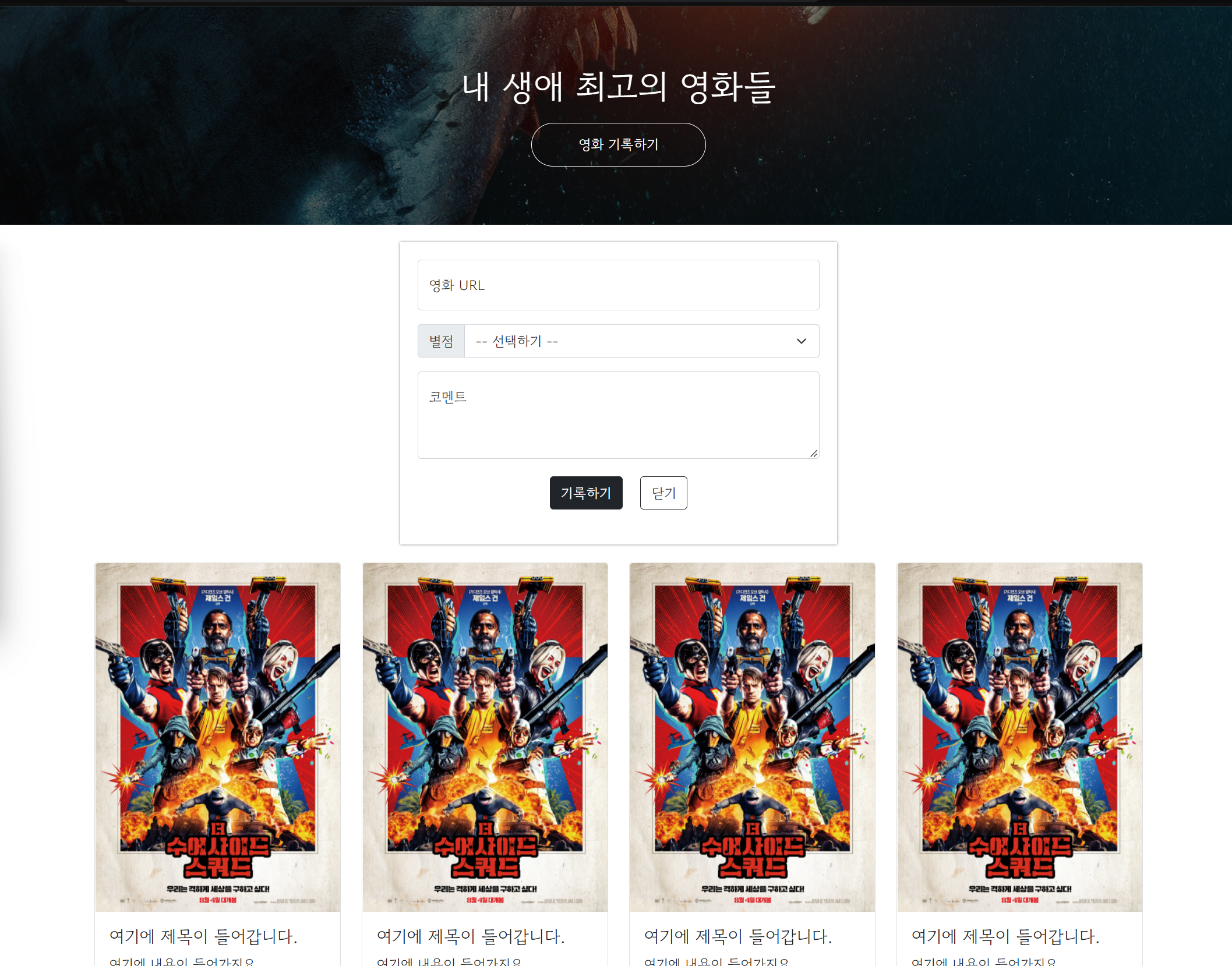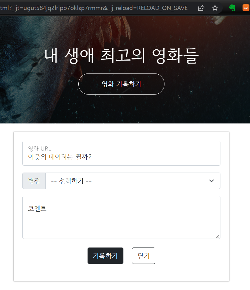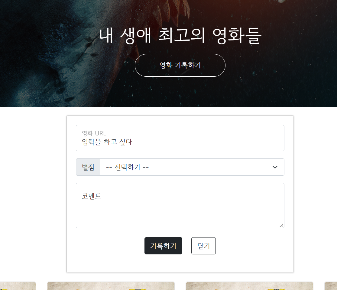 '영화 기록하기' 버튼을 누르면 숨겨진 창이 나타나고, '닫기'를 누르면 없어짐.